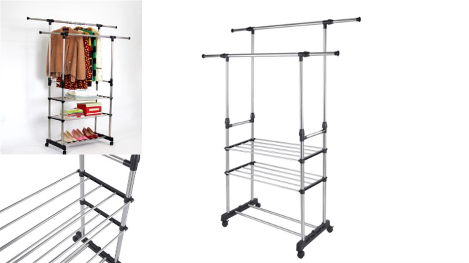 מתלה בגדים | מתלה בגדים כפול עם גלגלים מתקן לתליית בגדים פתרון קל ונוח עם מדפים נוספים לאחסון בגדים או נעליים. מתאים במיוחד לתליית ג’קטים, מעילים, חולצות מכופתרות צעיפים ועוד.. המתלה חזק ועמיד עם בסיס רחב ליציבות מושלמת הרכבה קלה ופשוטה ללא ברגים לאחסון פונקציונלי